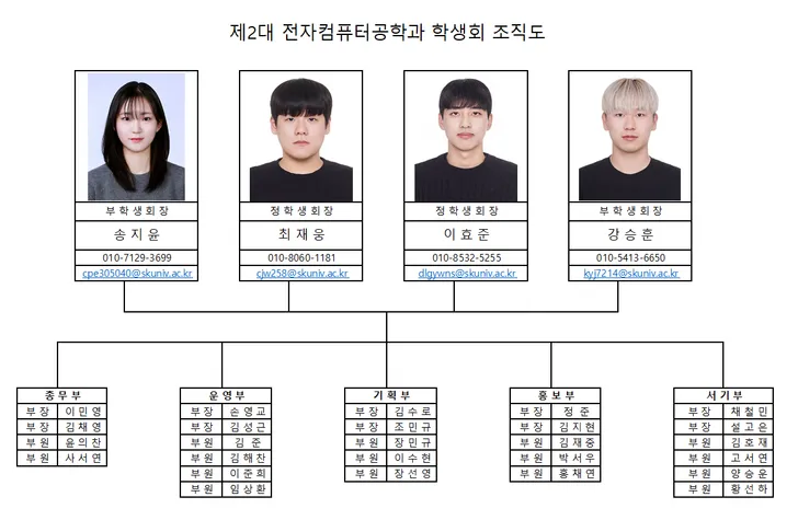 저희 학생회는 총무부, 운영부, 기획부, 홍보부, 서기부로 구성되어있으며, 총무부는 전자컴퓨터공학과의 학생회비를 공정하고 투명하게 관리하는 부서이고, 운영부는 모든 행사의 운영을 회장단과 함께 논의하는 부서이며, 기획부는 학과 모든 행사의 흐름을 기획하는 부서입니다.또한 홍보부는 학과 SNS 및 카드뉴스 제작 등을 도맡아 홍보를 위해 노력해주는 부서이며, 서기부는 학생회 회의 시 일어나는 모든 사항을 기록하고 이에 대한 정리본을 넘겨주어 사소한 것들을 놓치지 않게 해주는 부서입니다.